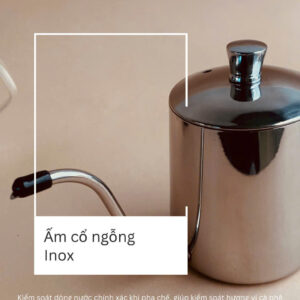 - Ấm cổ ngỗng Inox (Gooseneck Kettle): Thiết kế cổ ngỗng thon dài, cho phép bạn rót nước chính xác, kiểm soát dòng chảy một cách hoàn hảo – yếu tố then chốt của Pour-Over.