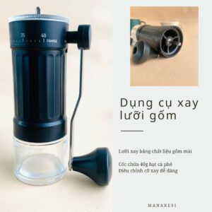 - Dụng cụ xay cầm tay lưỡi gốm: Cho phép bạn xay cà phê tươi mới ngay trước khi pha, giữ trọn vẹn hương thơm. Lưỡi gốm bền bỉ, dễ dàng điều chỉnh độ mịn.